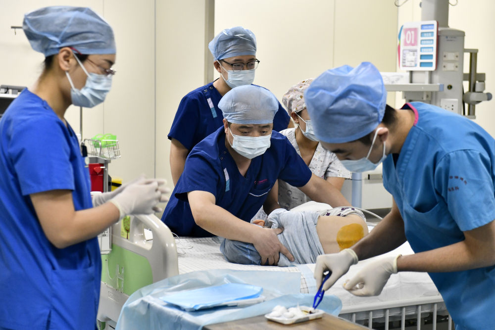 1月1日,在枣庄市妇幼保健院儿童ICU病房,医护人员准备为4岁的脊髓性肌萎缩症患儿注射靶向治疗药物诺西那生钠。(新华社 记者 郭绪雷 摄)