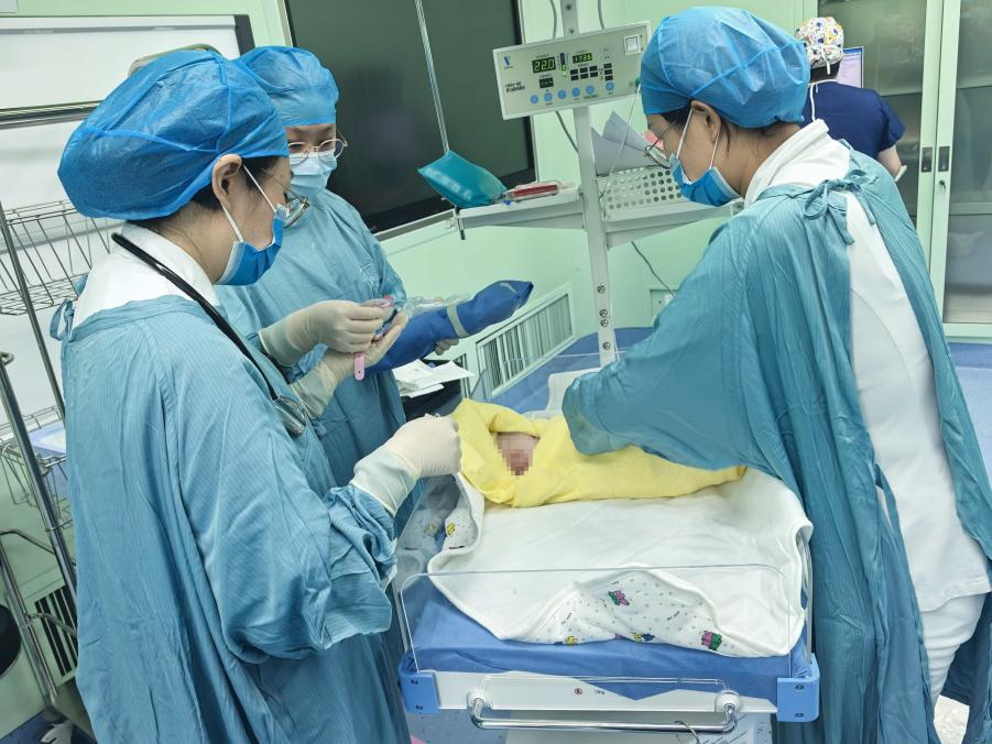 由于孕妇孕周仅32周胎龄,胎儿双顶径7.8cm,头颅仅相当于苹果大小,胎儿出生后仍面临严峻挑战。术前,儿科主任马晓宇迅速组建新生儿抢救团队;术中,产科副主任杨安宁和那娜副主任医师配合默契,争分夺秒抢救宝宝。最终,新生儿顺利出生,体重仅有1400g。
