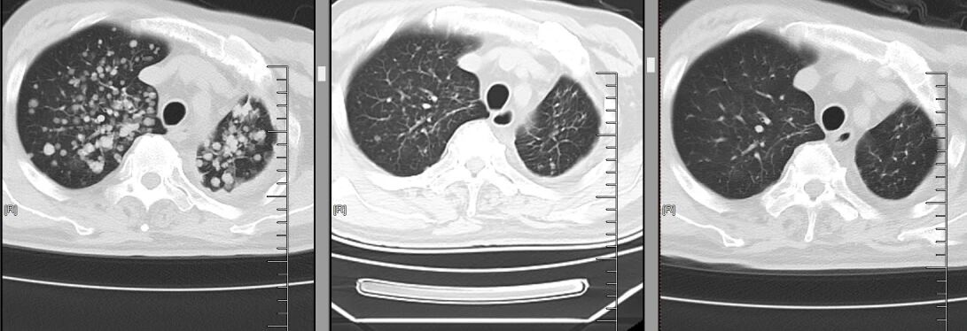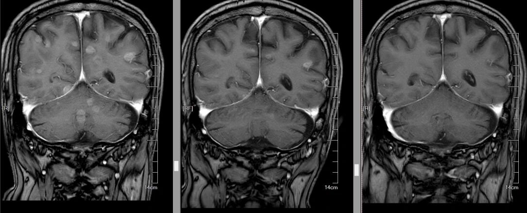 当肿瘤科将最新的胸部CT和头颅MRI图像调出来时,结果让人振奋:双肺原本密密麻麻的粟粒样转移结节,大多缩小至模糊不清,肺部原发灶也小了很多;双侧胸膜增厚明显变薄,原本被肿瘤侵犯的纵隔淋巴结也显著缩小;最令人惊喜的是头颅MRI,之前的十余处脑转移灶消失,近乎达到了肿瘤治疗中极具含金量的完全缓解(CR)标准!