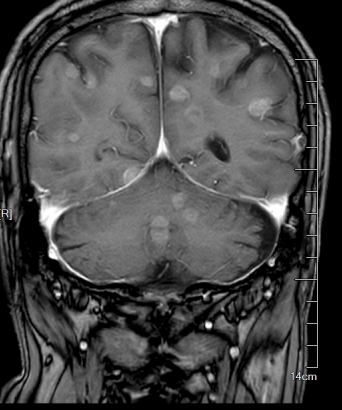 为进一步排查其他部位转移,庄主任随即安排了头颅MRI检查,患者颅内密密麻麻分布着十余处转移灶,最大的直径达3cm,最小的仅5mm,如同隐藏在脑部的定时炸弹。