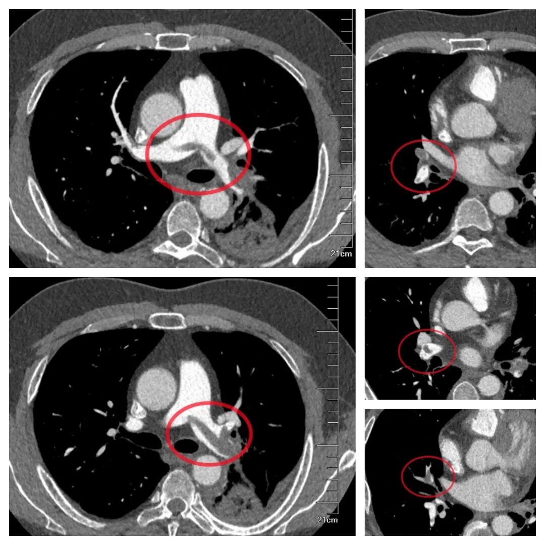 为明确诊断,医生迅速为小李安排下肢血管彩超检查,结果证实了担忧:右侧小腿肌肉内静脉附壁血栓,右下肢深静脉血栓形成,且血栓头端部分游离,随时可能脱落引发致命性肺栓塞。进一步的血气分析显示,小李存在严重低氧血症,强化肺动脉 CTA更提示双肺已出现大量血栓,救治刻不容缓!