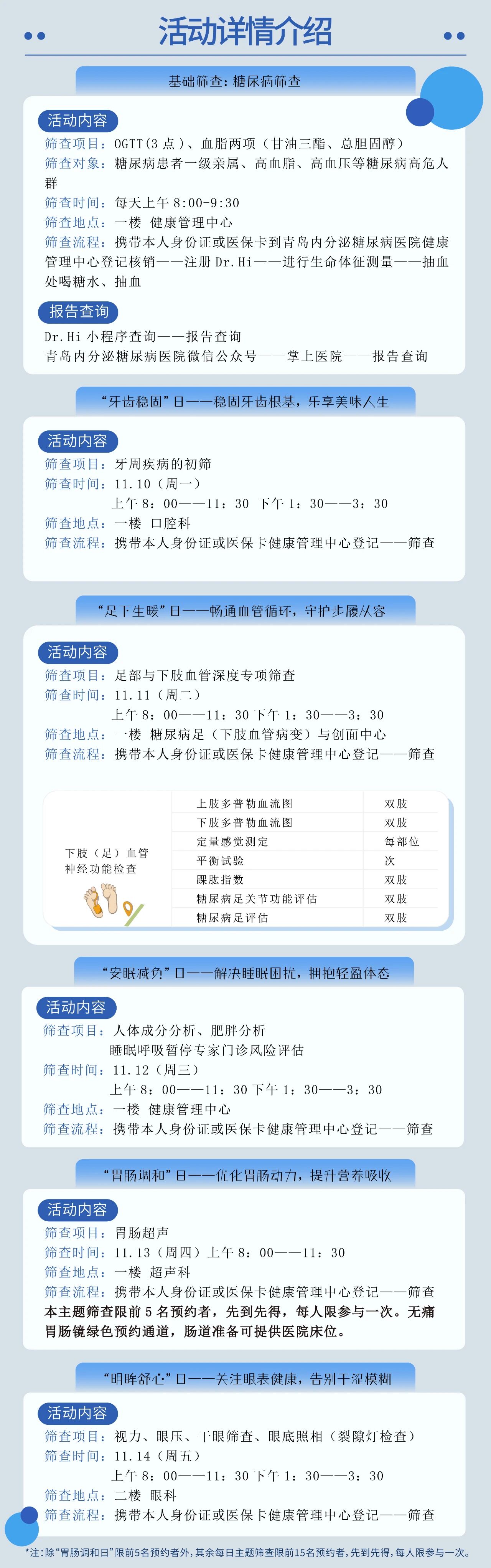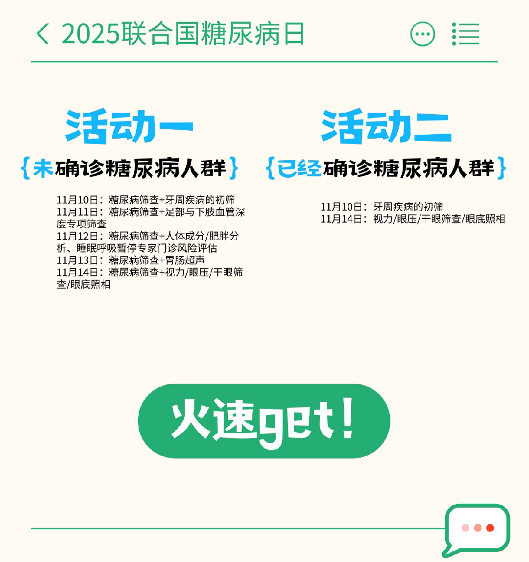 活动优先预约没有进行此类筛查/未确诊糖尿病人群,已确诊糖尿病人群可以参与11月10日的口腔筛查和11月14日的眼科筛查,请至少提前一天预约。
