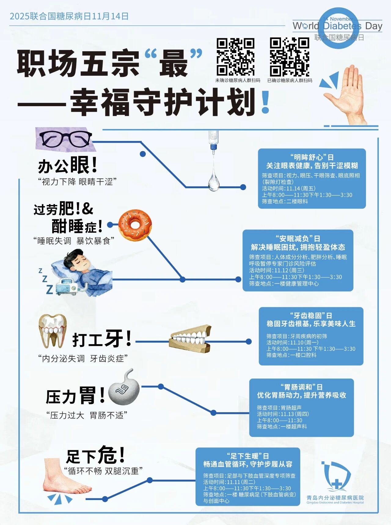 2025年11月14日是第19个联合国糖尿病日。国际糖尿病联盟(IDF)将2024-2026年的主题确定为“糖尿病与幸福感”,并特别将2025年的焦点指向“职场糖尿病”。