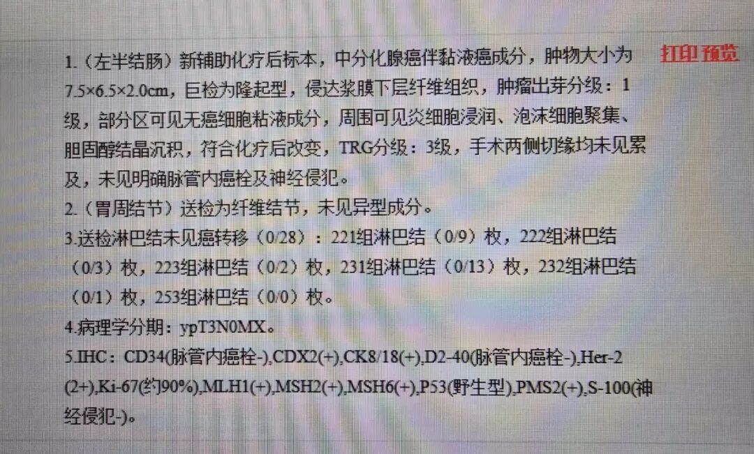 经过周密的术前准备,2025年9月23日,刘登强主任手术团队为患者实施了腹腔镜微创结肠癌根治术。术后病理提示淋巴结切除个数28枚,远超12枚的标准个数,印证了手术质量和手术彻底性,淋巴结零转移,也预示着患者会有个好的预后。
