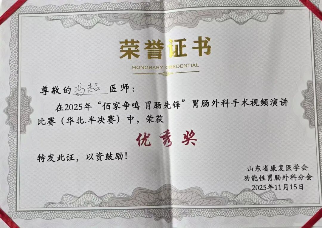 这台腹腔镜结肠癌根治术的手术操作视频,在刚刚结束的“佰家争鸣、胃肠先锋”手术视频大赛华北区半决赛中,取得了优秀奖的好成绩,来自全国各地的16位知名胃肠癌专家给予了该手术操作极高的认可,从另一方面彰显了新区中心医院胃肠外科在腹腔镜微创手术治疗胃肠癌方面取得的成绩。