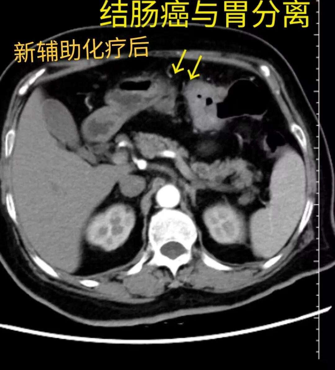 期间,患者每两周到门诊复诊,监测患者的体重,营养状态,血液学项目以及运动能力等情况,随着新辅助化疗的实施和功能锻炼,患者状态日益好转,在经历了新辅助治疗三个周期后,也就是就诊两个多月后,迎来了评估时刻。此时,患者体重无减轻,每日能步行4000-6000步,自我感觉状态良好。尤其是增强CT复查评估,效果非常好,经过三次化疗,结肠癌明显缩小,与胃壁的侵犯分离,手术不必再进行部分胃的切除。