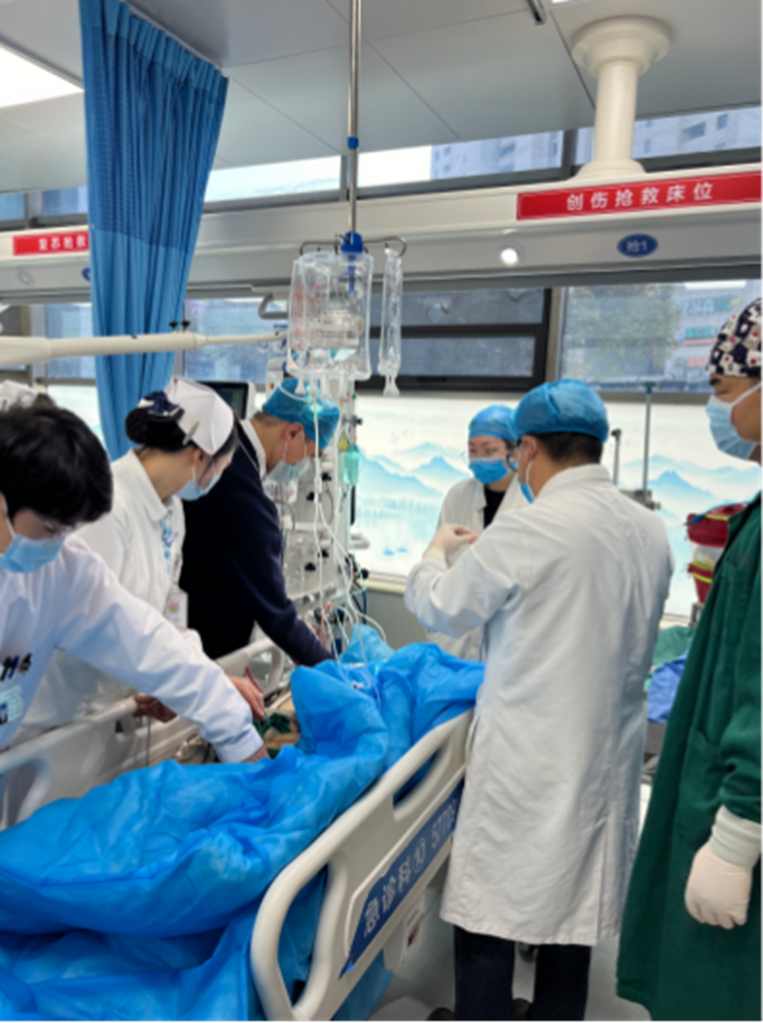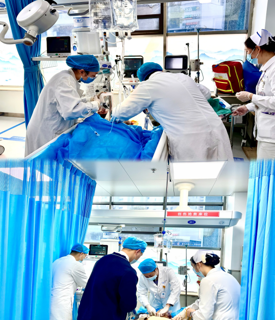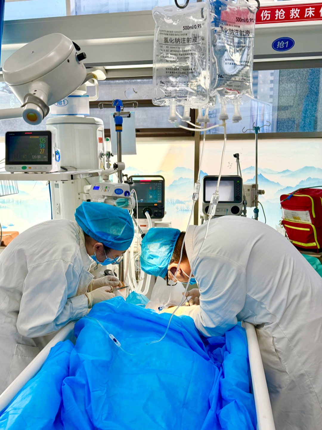近日,一名因严重车祸导致全身多发伤的“三无”中年男性患者被紧急送至本部院区急诊医学部。入院时,患者面部、口腔重度创伤、多颗牙齿脱落,下颌骨折伴严重错位,两处长达5公分创口,耳道、鼻腔、口腔伴有大量出血,左腿严重畸形,患者意识逐渐模糊,血氧饱和度一度下降至80%,极度呼吸困难,心率飙升至 130次/分,全身湿冷,出血量保守估计超 2000ml,各项生命体征都十分微弱。医护团队果断对患者实施气管插管、吸引器清除口腔血液,建立静脉通道,与此同时,杨永东医生为患者行深静脉置管,快速补液输血全力稳住生命体征,为后续抢救赢得了宝贵时间。
