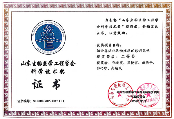 《帕金森病非运动症状的诊疗策略》项目由内分泌科副主任医师张剑英、神经内科副主任医师崔艳雷、神经内科副主任医师臧艳平、神经内科住院医师郭巧珍、睡眠医学科主任医师高焕民共同开展研究,聚焦帕金森病的非运动症状,系统地探索了诊疗的新思路与新方法,为临床规范诊治提供了科学依据与实践指引,对于提升区域内帕金森病的综合救治水平具有重要意义。