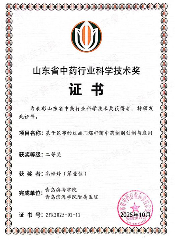 《基于昆布的抗幽门螺杆菌中药制剂创制与应用》项目由副教授高婷婷、药学部主任药师姜山、中医科副主任医师李长洋、消化内科主任医师郭威等共同完成,立足中药创新发展方向,依托我省海洋中医药资源优势,聚焦昆布这一药食同源中药材的药用价值,构建了“成分提取—机制阐释—制剂开发”的全链条研发体系。该成果不仅为幽门螺杆菌感染的中医药防治提供了新的解决途径,也为中药现代化与产业化发展提供了有益的探索,具有显著的临床价值与社会经济效益。