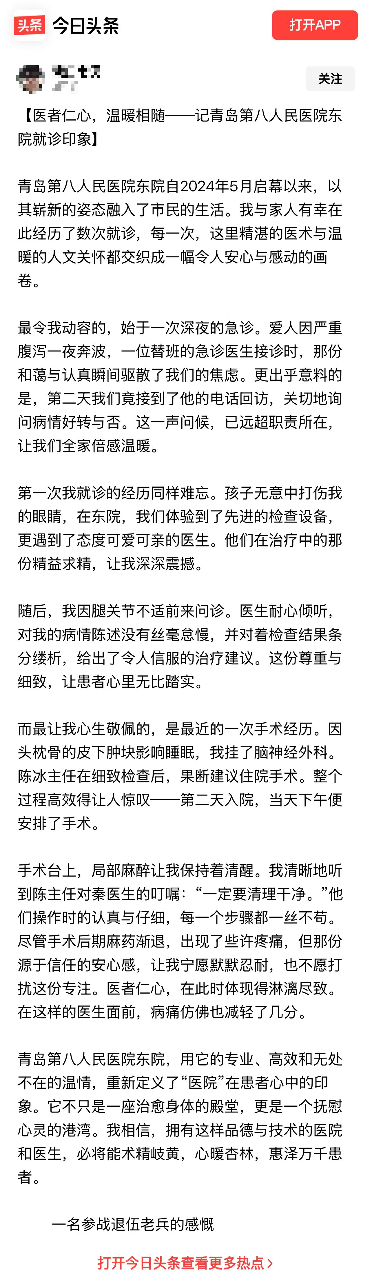近日,一篇题为《医者仁心,温暖相随》的患者自述在网络上引发关注。文字的背后,是一位退伍老兵在青岛第八人民医院东院区神经外科的真实就医经历。