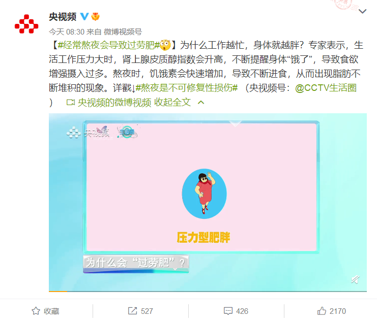 为什么工作越忙,身体就越胖?专家表示,生活工作压力大时,肾上腺皮质醇指数会升高,不断提醒身体“饿了”,导致食欲增强摄入过多。熬夜时,饥饿素会快速增加,导致不断进食,从而出现脂肪不断堆积的现象。