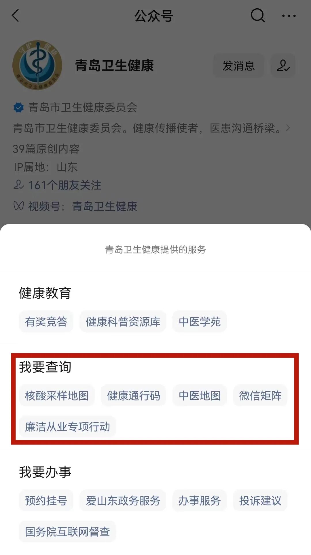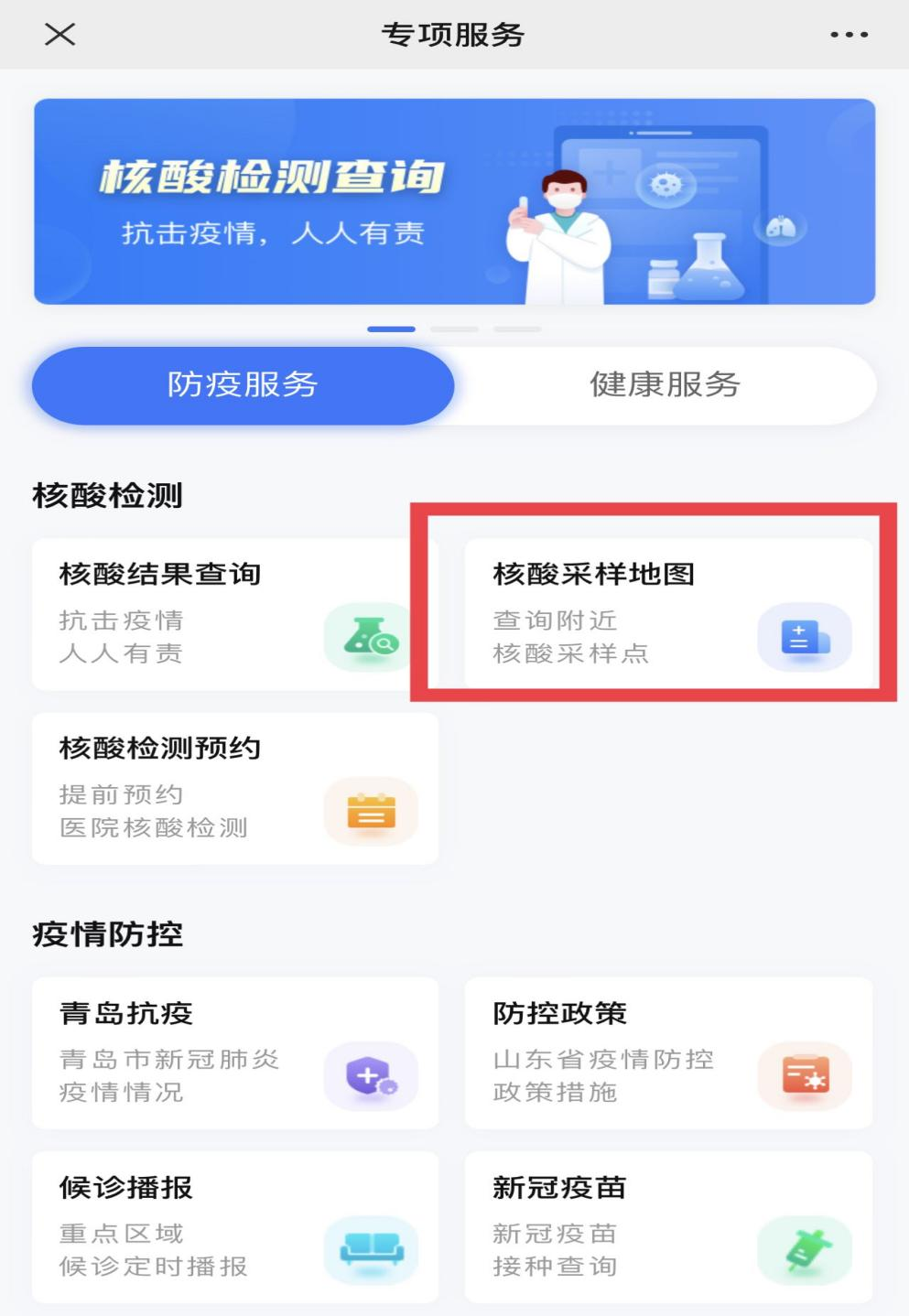 微信搜索公众号”健康青岛”,点击“服务”-“专项服务”-“核酸采样地图”。