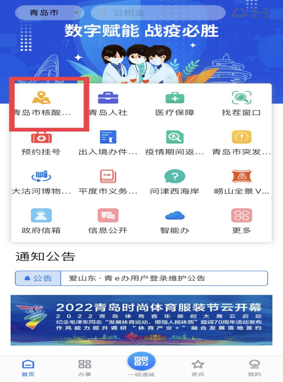 手机应用商店下载“爱青岛青e办”App,进入“首页”-“青岛市核酸采样点地图”。