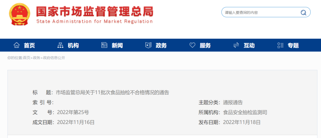 近日,市场监管总局通告11批次食品抽检不合格情况,结果显示,21大类食品728批次样品中,8大类食品11批次样品不合格