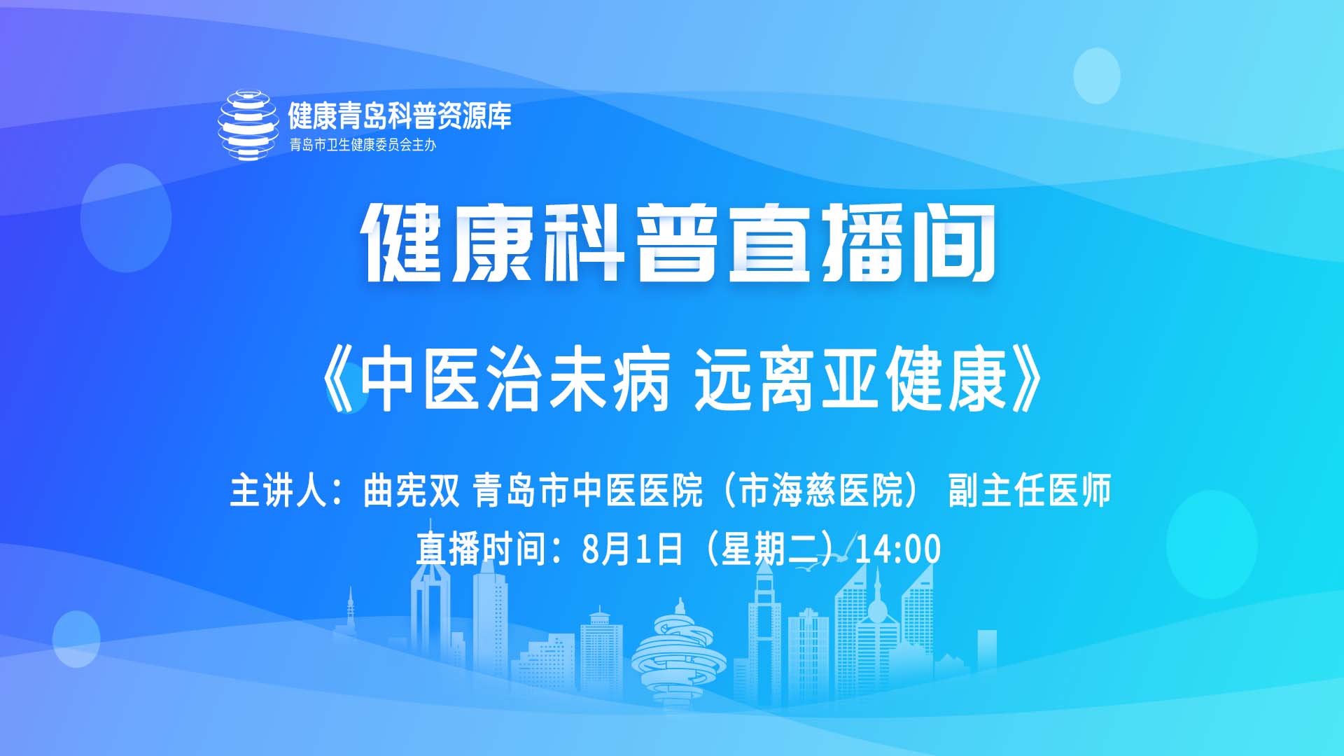 本次科普讲座特邀青岛市中医医院(市海慈医院)副主任医师曲宪双为大家带来专题讲座《中医治未病远离亚健康》,讲座全程网络直播,欢迎收看!