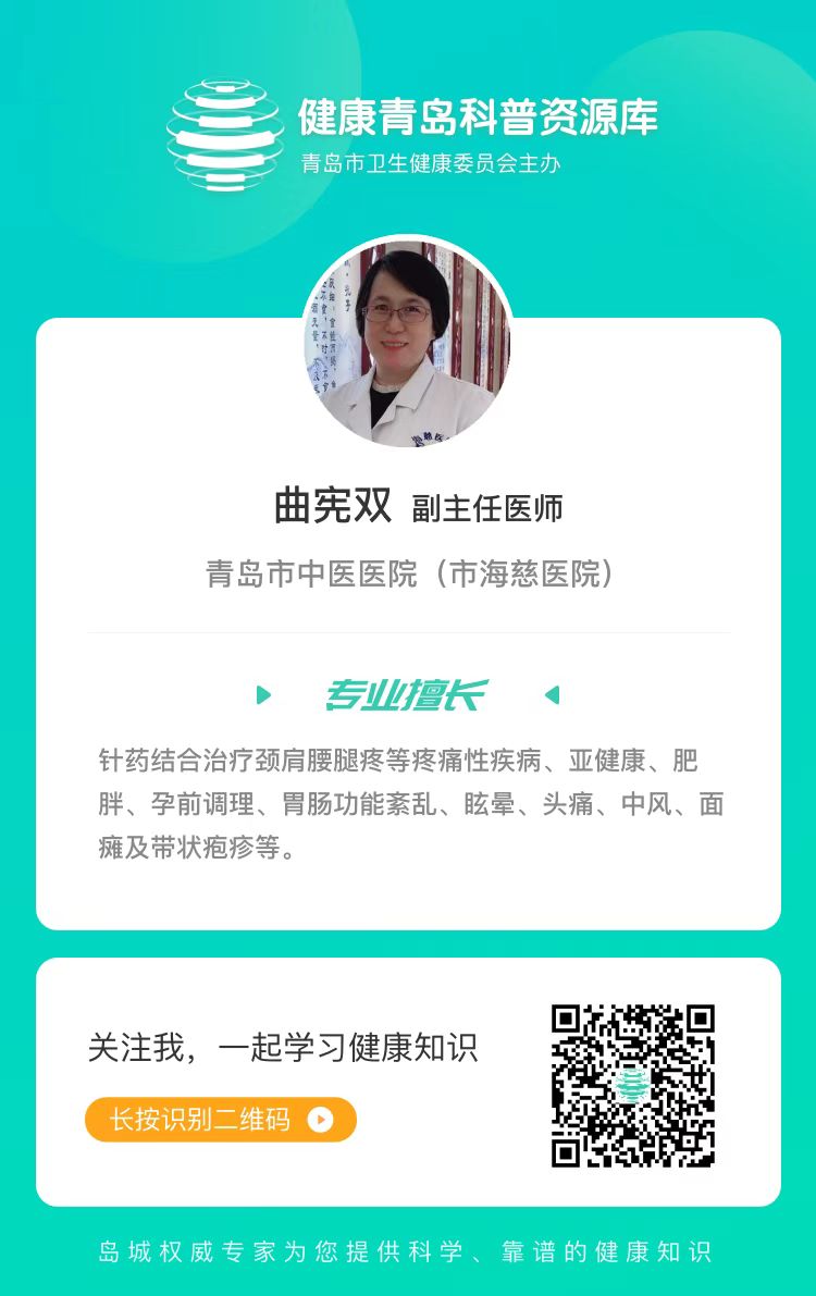 主讲人:曲宪双青岛市中医医院(市海慈医院)副主任医师,擅长针药结合治疗颈肩腰腿疼等疼痛性疾病、亚健康、肥胖、孕前调理、胃肠功能紊乱、眩晕、头痛、中风、面瘫及带状疱疹等。