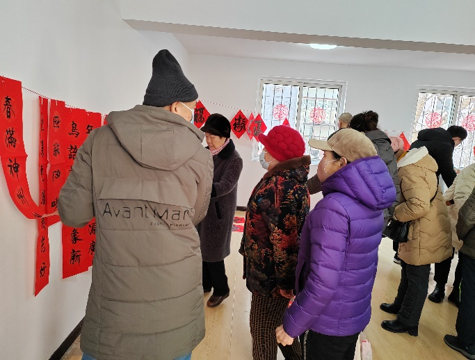 活动现场,书法爱好者们纷纷挥毫泼墨,大展风采,楷书草书隶书行书……,或隽永娟秀,或苍劲有力,各有神韵,吸引了居民群众围观评品。“一帆风顺年年好 万事如意步步高”“龙年思源心向党 春风吹暖万家香”,春联内容既有辞旧迎新的美好愿景,也有歌颂党恩、大展宏图的励志词句。一幅幅喜气的春联摆满大厅,一张张火红的福字挂满墙壁,居民们对各位老师的书法作品赞不绝口,认真的挑选自己称心如意的福字和春联,或邀请中意的书法家为自己书写一幅满意的作品。浓浓的墨香,美好的祝福,寄托了人们对美好生活的热爱、憧憬和向往,为即将来临的春节增添了浓浓的“年”味。
