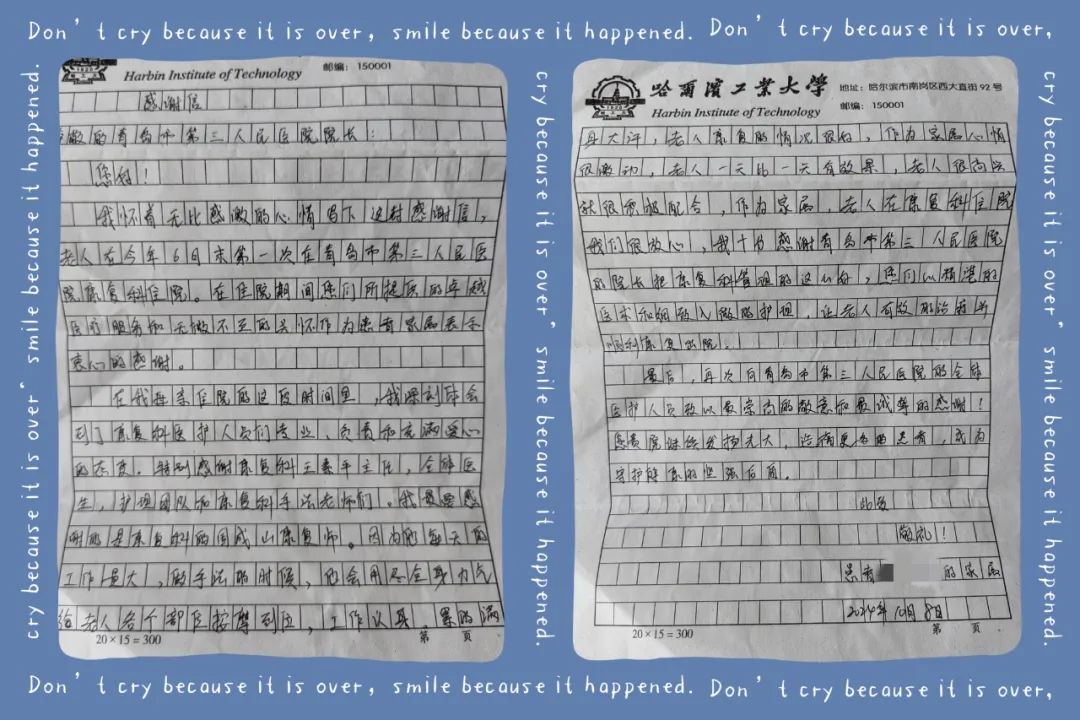 “住院期间,你们卓越的医疗服务和无微不至的关怀,让我备受感动。十分感谢……”近日,青岛市第三人民医院康复医学科收到一份特殊的礼物,是患者家属为表达感谢,一笔一划手写的感谢信,信中言语朴实、情真意切,字里行间透露着温暖和感动。