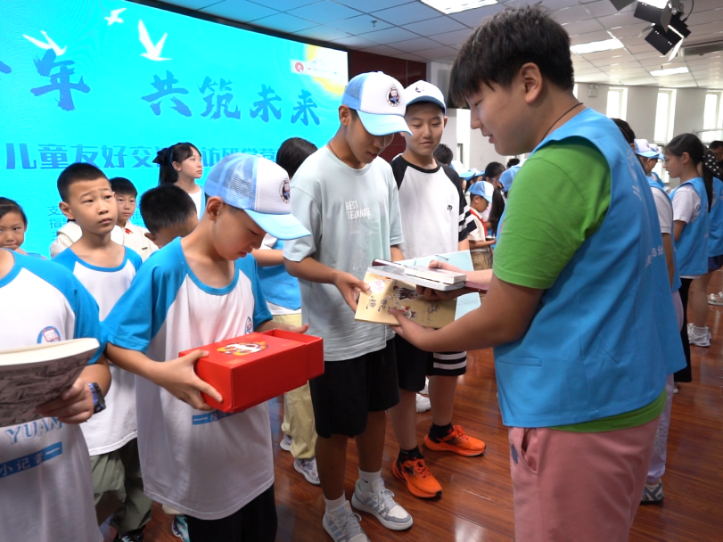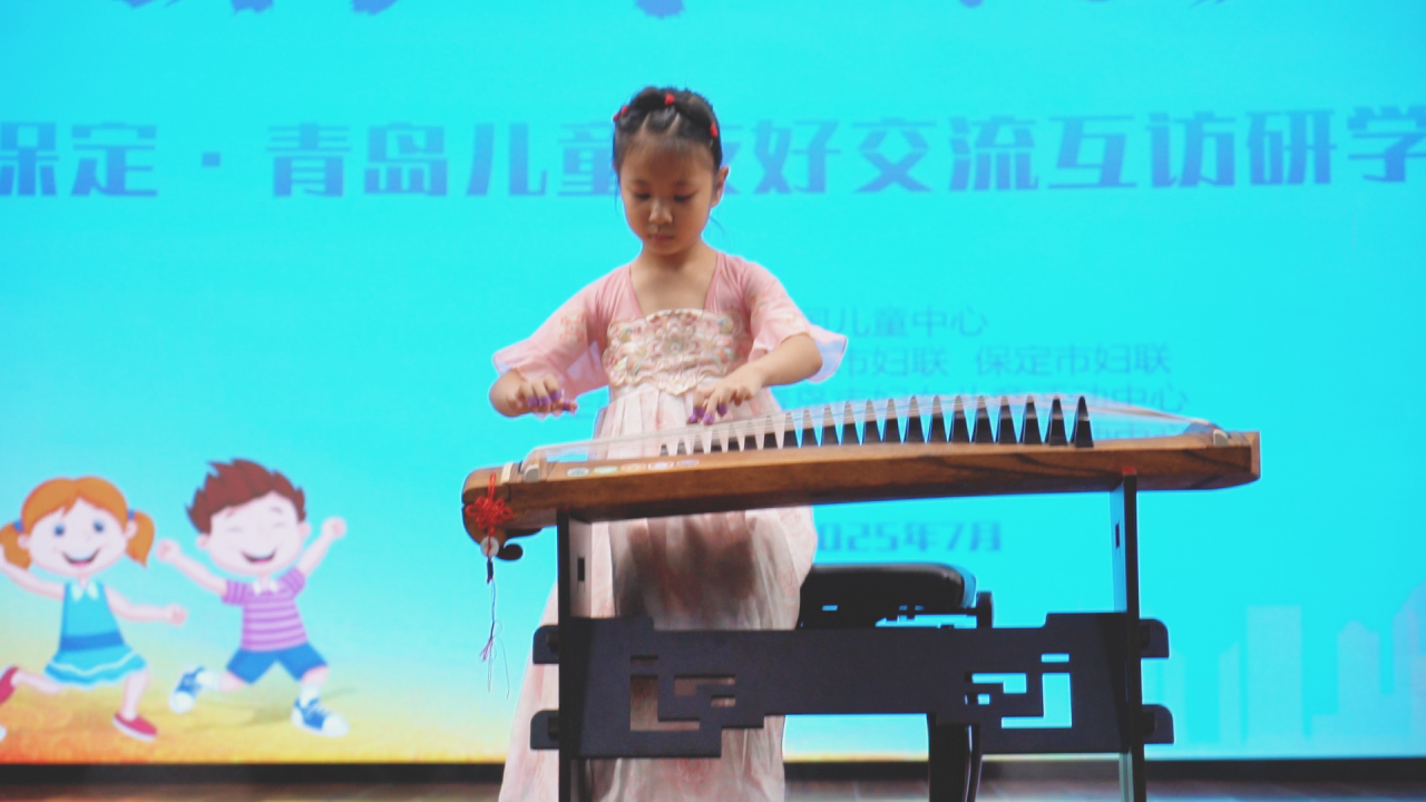 青岛儿童友好研学院团员们化身小文旅推介官,向保定小伙伴们分享介绍了青岛独具特色的地标性建筑、特色美食以及海洋动物等。两地儿童互赠精心准备的特色礼物,并表演了京剧《梨花颂》、古筝《小小竹排》、独唱《明天,你好》等精彩节目。最后,保定小团员们集体朗诵的原创诗歌《童心筑彩虹,渤海湾的对话》,将开营式现场气氛推向高潮。