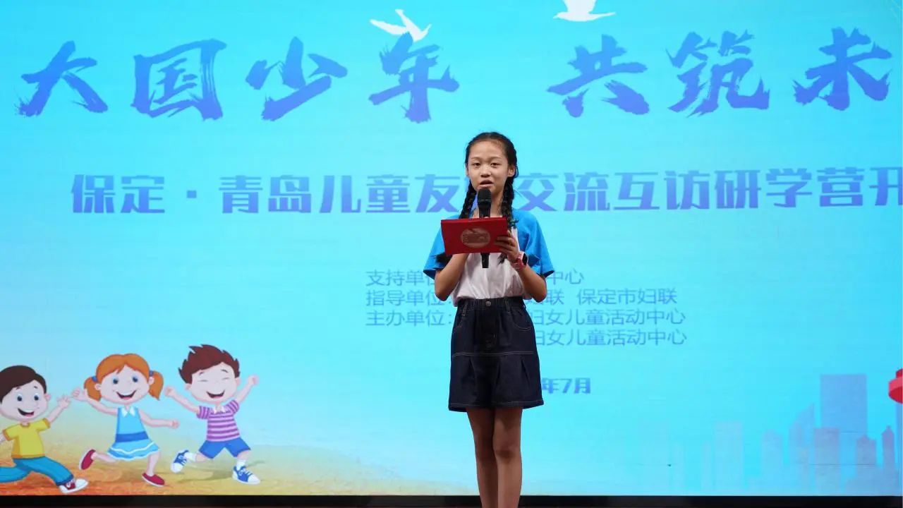 保定儿童友好研学院团长杨梓彤代表全体团员发言,表达了对青岛儿童友好之旅的期待与感谢,希望和青岛的小伙伴一起手拉手心连心,以更加开放和包容的心态去面对这个多彩的时代,共同学习探索,用脚步去丈量美丽的世界,做一个奔涌向前的“大国少年”。