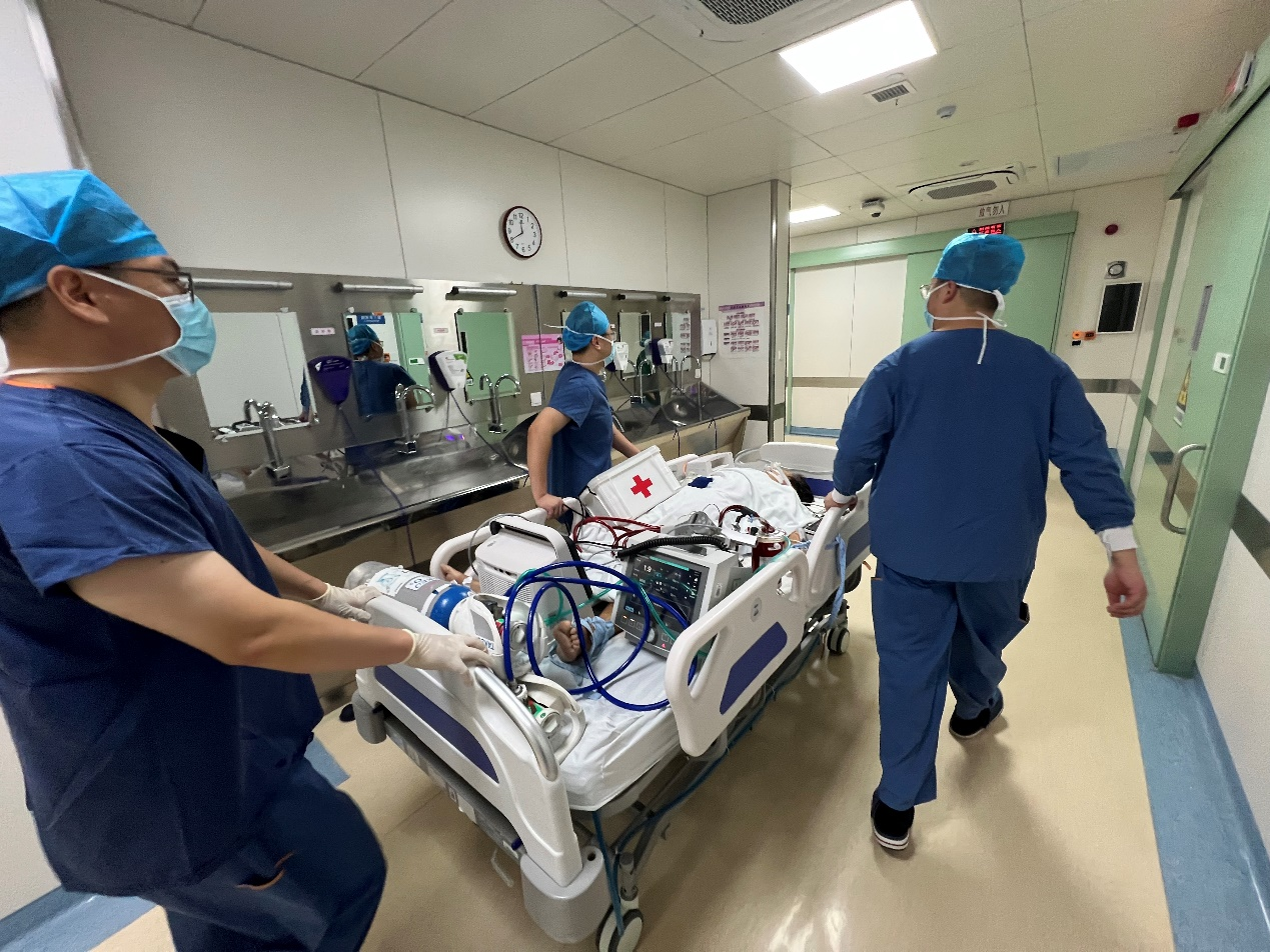 此时,本已下班却临时赶回的重症医学科平度病区副主任刘冰主动扛起重任,带领李霞医生、张丽君医生快速完成体外膜肺氧合(ECMO)穿刺置管;冯晓鹏、韩青昂、曲珂佳三名护士紧密配合,精准操作器械,于22:26成功启动ECMO机器,为患者筑起一道关键的生命防线,有效缓解了机体缺氧危机。