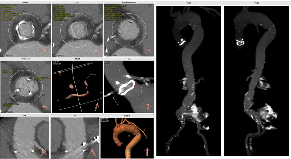 测得外科生物瓣内圈面积413.5mm^2,折合内径22.9mm;测得瓣架高度15.3mm;主动脉弓-降主动脉可见锐折角;主动脉各段-髂总动脉可见散在点状钙化及瘤样扩张;左右冠同窦,窦部空间充足,双侧冠脉风险低。