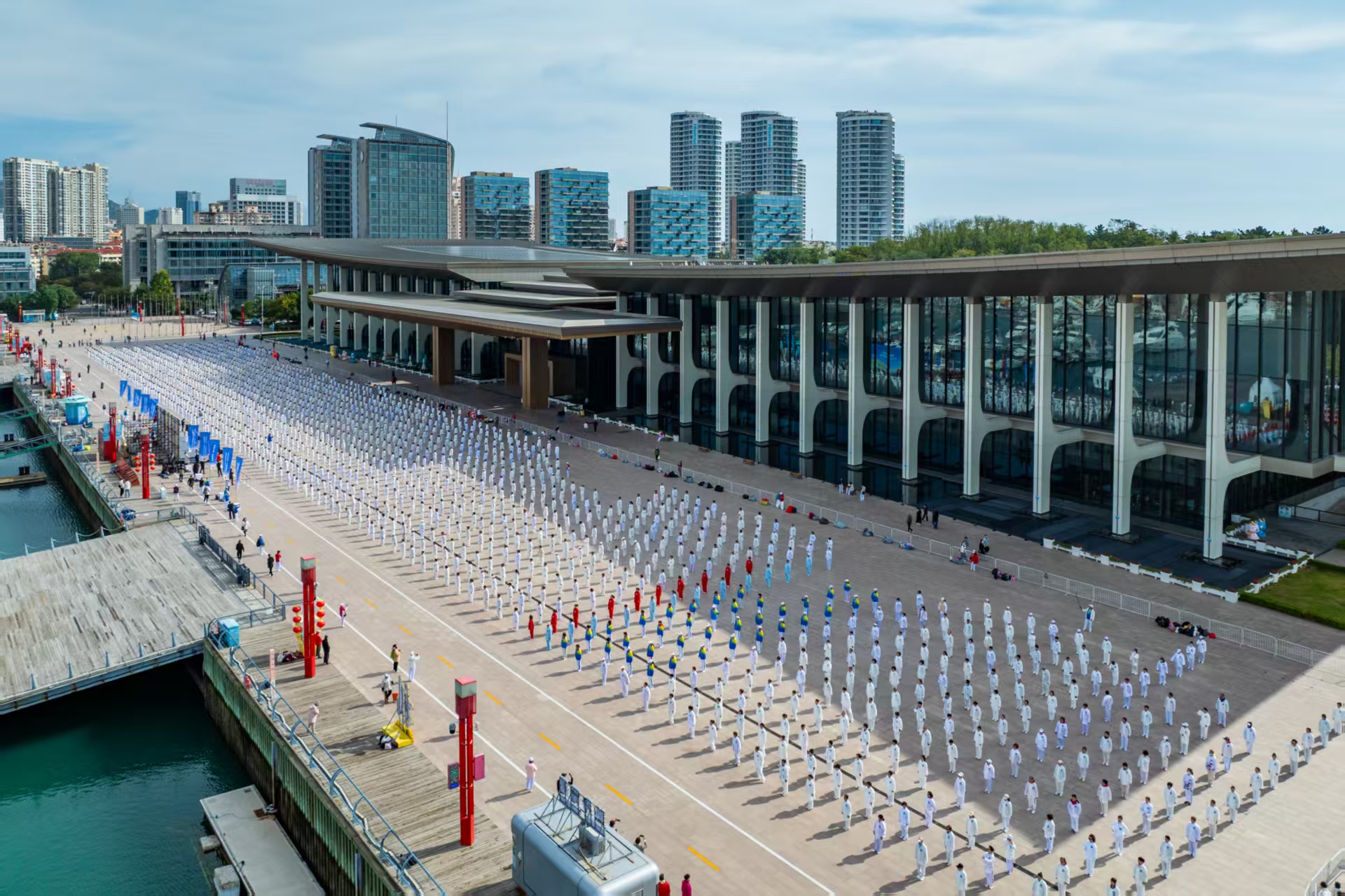 清晨8时,浮山湾的海风还带着微凉,奥帆中心广场已涌动着热闹的人潮。数千名太极拳爱好者陆续抵达,晨光中,他们统一身着白色中式服装,形成一道道鲜活的风景线。在志愿者引导下,大家按照预先划定的区域有序列队,从广场入口到中心舞台,队伍如长龙般延展。9时许,广场上已排好整齐的阵列,透出几分恢弘气势。