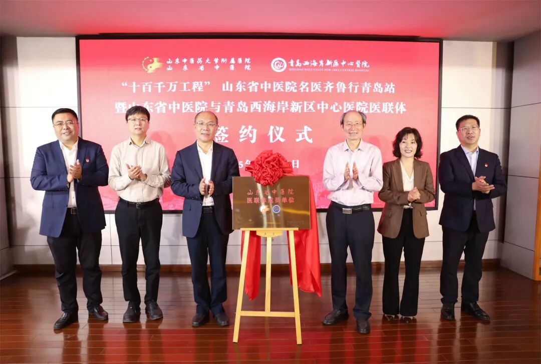山东省中医院副院长李刚、山东省中医院公共事业发展部副主任路士华、青岛市卫生健康委员会中医药管理指导处处长汪运富、青岛西海岸新区卫生健康局二级调研员黄萍、青岛西海岸新区中心医院党委书记吴磊、党委副书记、院长孙建伟共同为“山东省中医院与青岛西海岸新区中心医院医联体”揭牌。