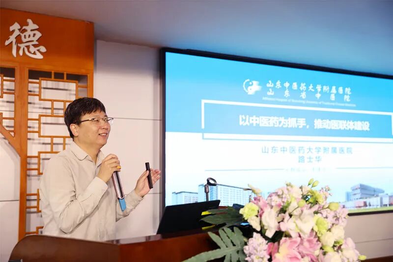 签约揭牌仪式结束后,山东省中医院公共事业发展部副主任路士华受邀为新区中心医院全体中层以上干部作《以中医药为抓手,推动医联体建设》专题授课。