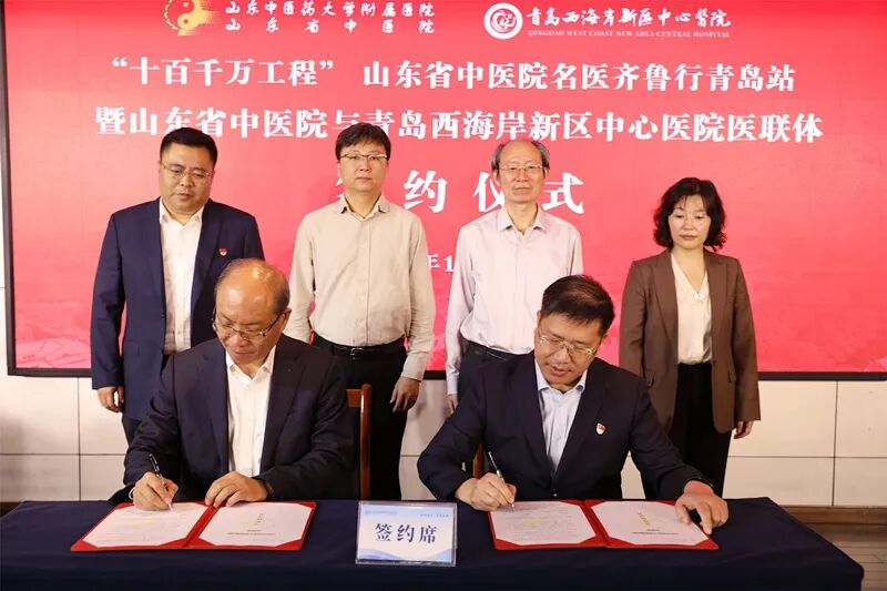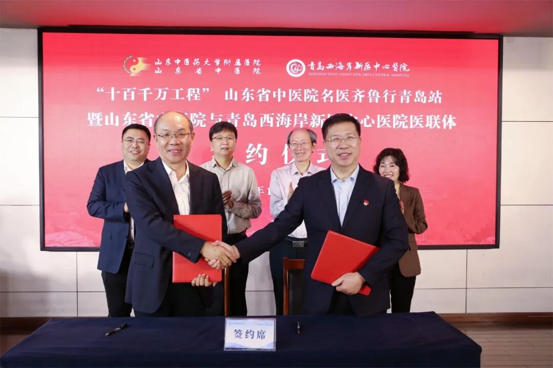 山东省中医院副院长李刚与青岛西海岸新区中心医院党委副书记、院长孙建伟共同签署《山东中医药大学附属医院医联体合作协议书》。汪运富、黄萍、路士华、吴磊共同见证签约。