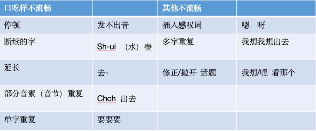 口吃是指儿童在语言发育期,言语流畅性明显低于年龄预期,表现为声音、音节、字、或词的重复伴有声音或字词的延长,以及阻断和回避或替换字。伴随症状包括眼睛眨动、下巴抖动及头部的动作等,以此来减轻口吃的程度。并不是所有的不流畅都是口吃。有的儿童,只是在发育过程中,短暂出现“其他不流畅”情况。区别如下: