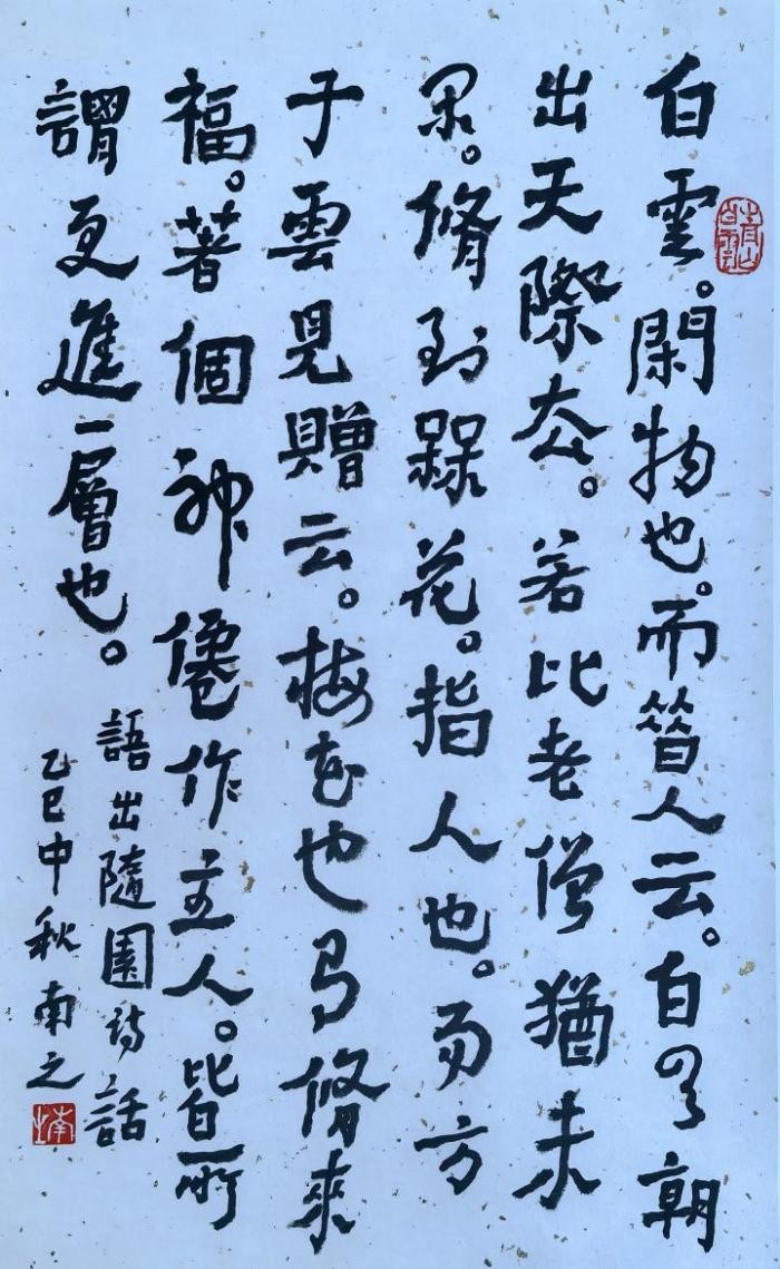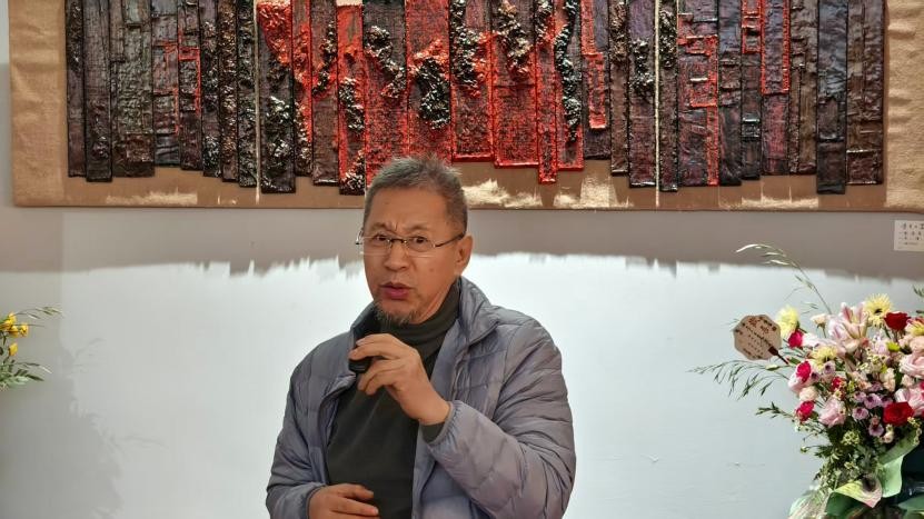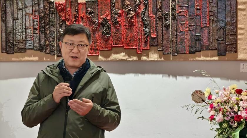 姜平林客串开幕式主持人,作为刘蓓蓓的书法篆刻老师,姜平林介绍,刘蓓蓓深耕传统艺域三十载,六岁学画,先后就读于青岛六中、四川美院本科,于青岛大学研究生毕业,后奔赴福建深造大漆技艺两年,近年又着迷于书法篆刻。她始终以“融传统于当代”为创作核心,此次个展,正是她以多年艺路深耕为基,将多元艺术语言熔于一炉的集中呈现。每一件作品,都是她对“美”的独特诠释,亦是心与物、技与道的深度交融。书法里,刘蓓蓓兼收博采,点画线条刚柔并济,楷隶篆书端雅稳健,行书碑帖互参,墨色浓淡相融,不刻意追摹古法,却在落笔处得见传统功底;篆刻中,她以刀代笔,方寸之间,线条粗细转折皆有章法,朱白对比暗藏巧思,既守篆刻的规整法度,又赋予印章鲜活的当代写意趣味;而大漆作品,更是此次展览的点睛之笔——她耐心打磨漆层,巧妙融入金、银、木、灰、布、绳等材质,让大漆在时光沉淀中呈现出温润的光泽与丰富的肌理,既让书印作品有了可触摸的温度,更暗合“慢工出细活”的传统造物精神,以“千磨万击始成器”的工序特质,呼应着传统艺术的传承初心。此次个展是刘蓓蓓对传统艺术的深度溯源,亦是对当代创作的大胆探索。
