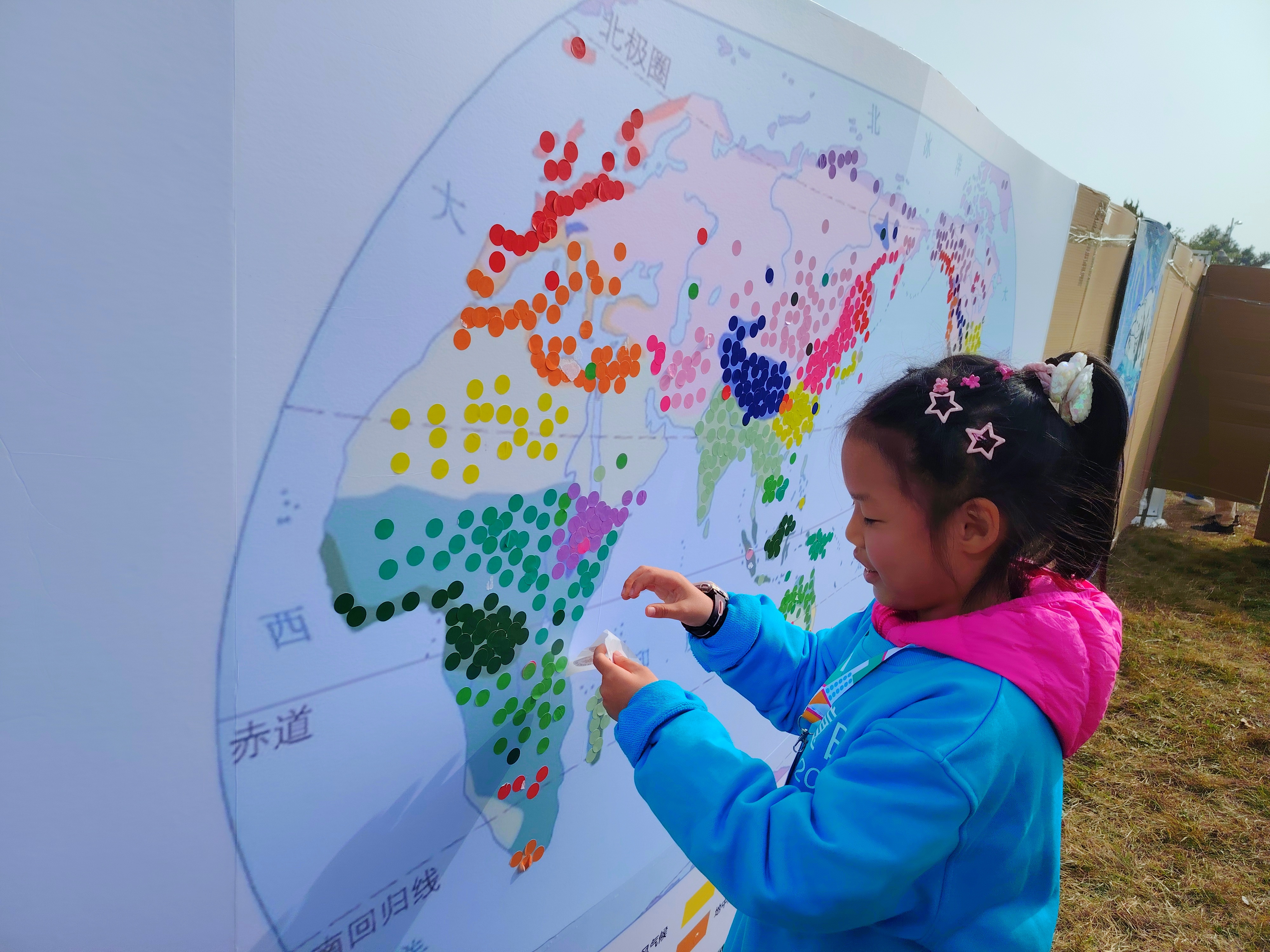 本次活动的最大亮点,莫过于一座专门为儿童打造的“气候探索迷宫”。该迷宫由140张1.5×90公分的环保纸壳搭建而成,其整体造型灵感来源于青岛儿童友好标识,巧妙地将在地特色与环保理念融为一体,成为孩子们流连忘返的“趣味闯关乐园”。迷宫区域内,一系列儿童友好型气候趣味科普活动精彩纷呈:在知识探秘区,孩子们走进迷宫通道,纸壳展板上生动有趣的气候主题知识介绍,引导儿童在“探索”中学习;在互动闯关区,丰富有趣的气象科普游戏穿插其中,让孩子们在玩乐中理解气候变化与自身生活的联系;在低碳零废展览区,由青岛市妇女儿童活动中心、城阳区育才小学、城阳区夏庄小学、城阳区第三实验小学、城阳区云头崮小学等单位提供的儿童低碳创意环保手作展,充分展示了青岛儿童的奇思妙想以及创意十足的绿色环保理念;在“儿童涂鸦区”,孩子们用画笔自由表达了对绿色地球的向往。在迷宫的出口处,一面巨大的“气候地图”主题板静静矗立,孩子们将手中代表不同气候带的彩色贴纸,贴在地图的相应位置。随着一张张彩贴汇聚,一幅色彩斑斓的世界气候地图被逐渐“点亮”,象征着孩子们共同守护地球家园的美好愿景。