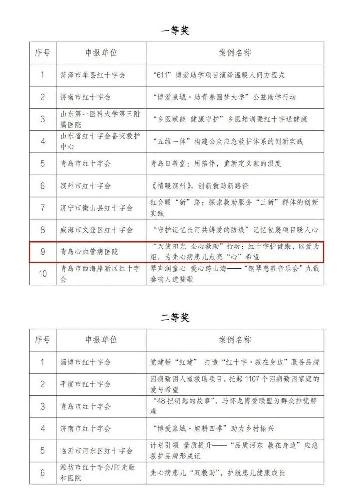 2008年以来,青岛心血管病医院在中国红十字基金会统筹部署与山东省、青岛市红十字会积极推动下,深入贯彻落实党中央、国务院关于保障困难群众基本医疗权益、推进健康中国建设的决策部署,积极开展“天使阳光全心救助”项目,聚焦14周岁以下因病致困家庭先心病患儿,以系统性组织和特色化服务,让千余名患儿重获“心”生,用实际行动践行“人民至上、生命至上”的理念,精准解决了群众急难愁盼,展现了红十字精神和医院服务人民的温度与深度。