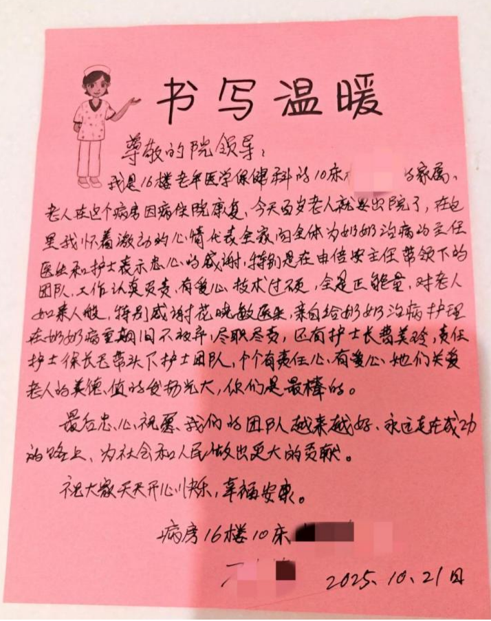 近日,山东大学齐鲁医院(青岛)保健科/老年医学科医护团队凭借严谨的医疗态度与多学科协作,成功救治了一名巨大型食管裂孔疝高龄患者,实施了精准营养支持。临近出院,老人家属给我们留下了一封感谢信,对医护团队在老人住院期间的精心救治表达了感激之情。