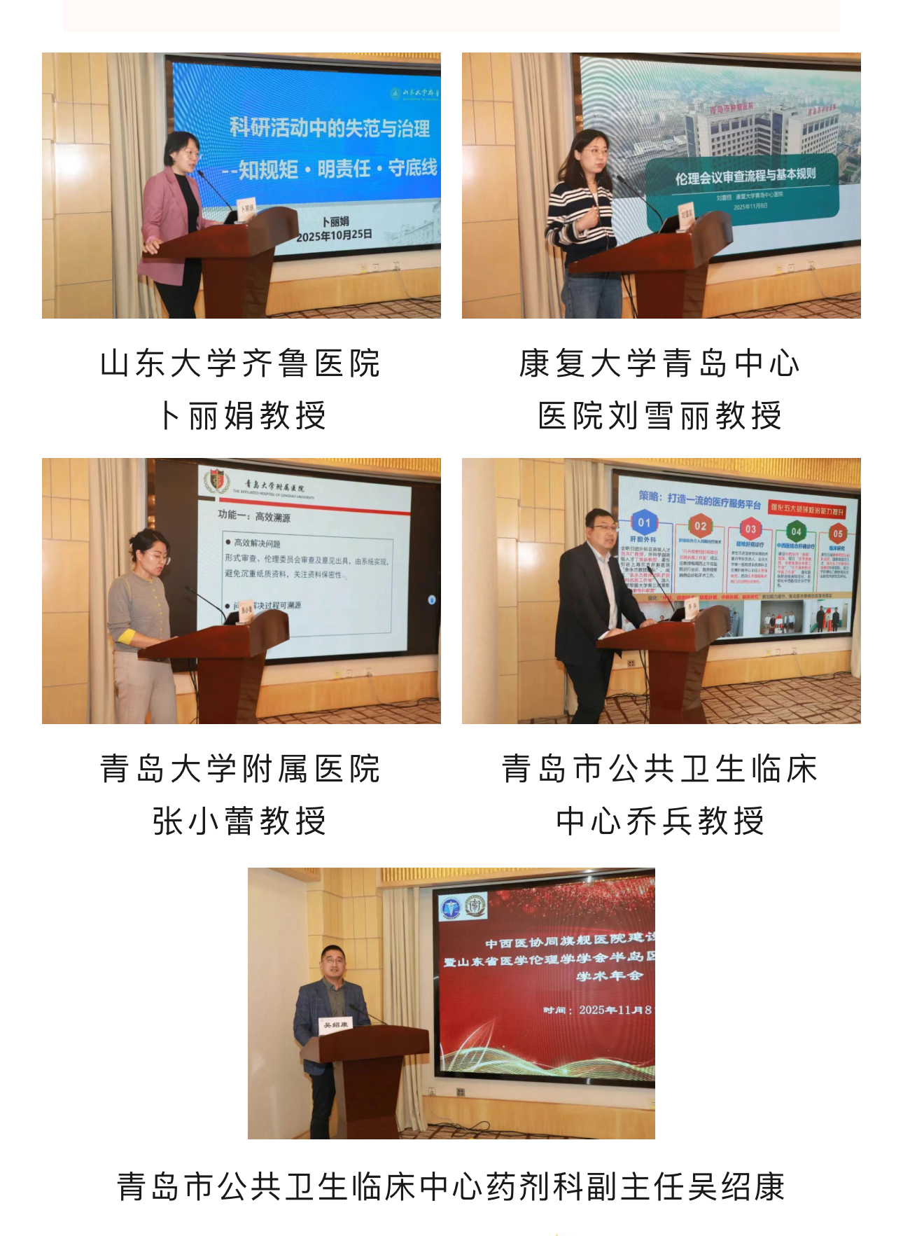 会议邀请了山东大学齐鲁医院卜丽娟教授、康复大学青岛中心医院刘雪丽教授、青岛大学附属医院张小蕾教授、中心乔兵教授等专家围绕《科研失范与治理》《伦理会议审查流程与基本规则》《临床试验伦理审查中的常见问题浅谈》《中西医协同引领旗舰医院建设》等内容进行了高水平的学术讲座和授课,中心药剂科副主任吴绍康参与主持学术会议环节。