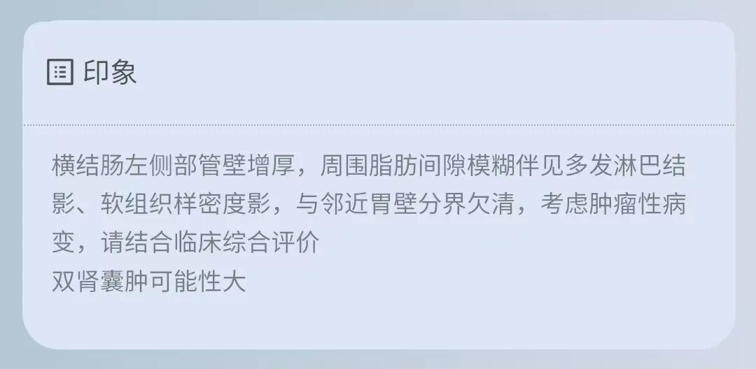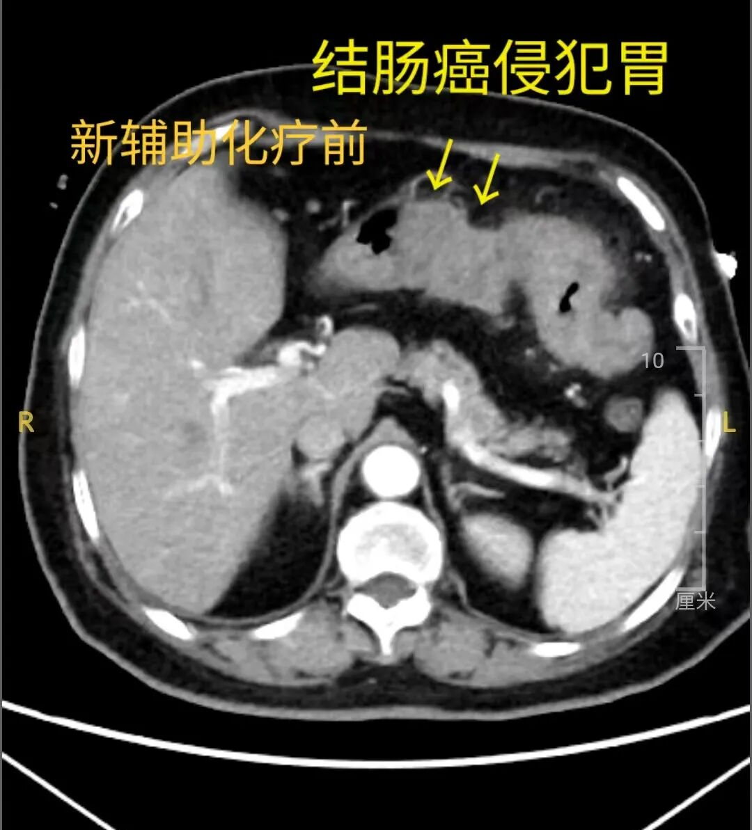期间,患者每两周到门诊复诊,监测患者的体重,营养状态,血液学项目以及运动能力等情况,随着新辅助化疗的实施和功能锻炼,患者状态日益好转,在经历了新辅助治疗三个周期后,也就是就诊两个多月后,迎来了评估时刻。此时,患者体重无减轻,每日能步行4000-6000步,自我感觉状态良好。尤其是增强CT复查评估,效果非常好,经过三次化疗,结肠癌明显缩小,与胃壁的侵犯分离,手术不必再进行部分胃的切除。