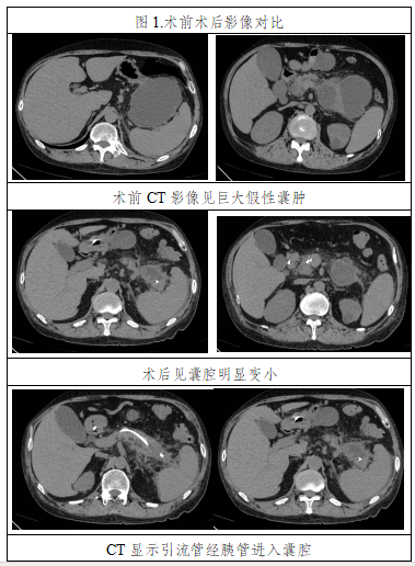 患者为中年男性,有长期大量饮酒史,病程中多次因胰腺炎急性发作于外院就诊,此次因剧烈腹痛伴发热4天入院。腹部CT显示胰腺假性囊肿直径已达90mm,较前明显增大,并伴有胰管梗阻,拟诊为“酒精性慢性胰腺炎伴胰腺假性囊肿形成”,病情复杂危重。