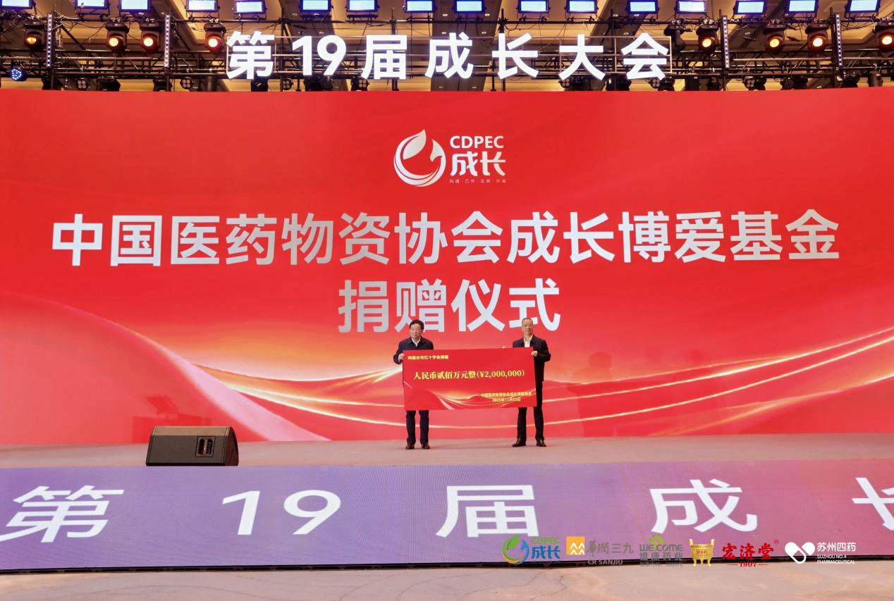 同期举行中国红十字会成长博爱基金捐赠仪式,让医药企业家的爱心在秀山丽水间孕育出灿烂花朵。中国医药物资协会荣誉会长刘忠良与丽水市红十字会党组书记、常务副会长周海忠代表上台捐赠。