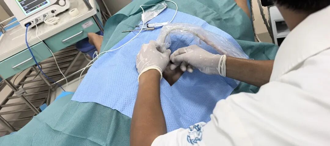 近期,一例患者因颈部脊髓损伤导致上肢神经病理性疼痛,在青岛大学附属医院康复医学科平度病区介入治疗室顺利完成超声引导下射频治疗。患者因车祸伤,导致颈部脊髓损伤,上肢疼痛,酸胀,影响患者睡眠及康复训练,传统的药物治疗效果差,经讨论,决定给于患者超声定位下星状神经节脉冲射频治疗,排除手术禁忌,超声定位星状神经节,消毒处理后,在超声引导下,穿刺针精确到达治疗靶点,感觉运动测试后,应用脉冲治疗模式,术中监测患者生命体征,顺利完成治疗过程,患者感受良好,疼痛症状缓解。
