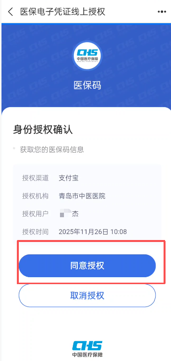 4.首次使用支付宝医保账户会有身份确认提示,点击同意授权;
