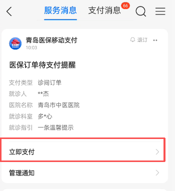 2. 点击消息提醒,即可查看您的待支付类型,选择“立即支付”;