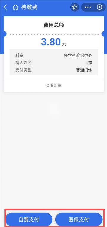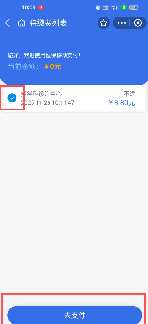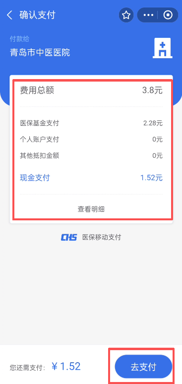 6.查看医保基金支付、个人账户支付和自费金额,确认金额无误后点击“去支付”;