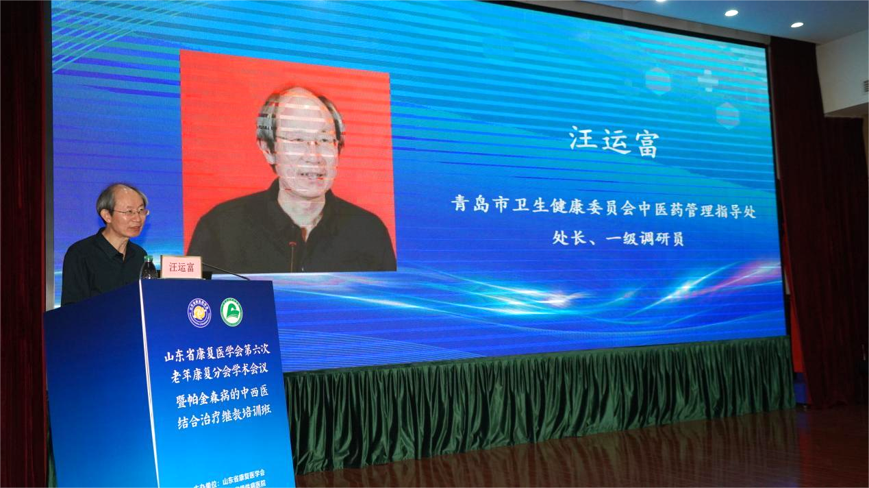 青岛市卫生健康委员会中医药管理指导处处长汪运富发表致辞。汪处长详细介绍了青岛作为双示范项目城市的医疗资源优势和工作亮点,并期待通过此次会议,为全市乃至全国老年康复及中医药创新事业注入强劲动力。