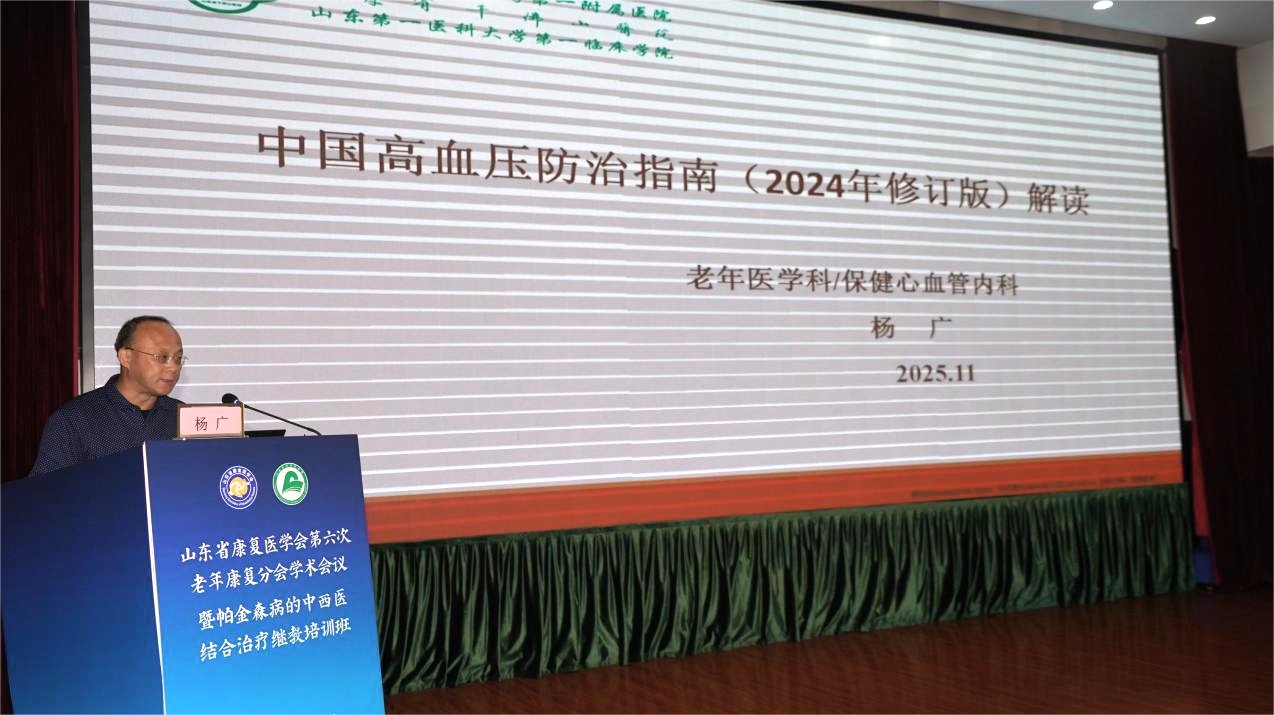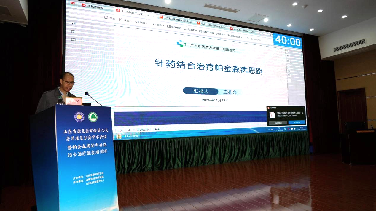 广州中医药大学第一附属医院庄礼兴教授分享了《针药结合治疗帕金森病思路》,展示了传统针法及中药在帕金森病及其并发症治疗中的独特价值。山东大学齐鲁医院岳寿伟教授通过《康复数字背后的故事》,深入解析了康复医学领域的创新探索与重要突破,实现了科技进步与民生关怀的有机融合。青岛大学附属医院王强教授讲解了《姿势解密技术在帕金森病患者中的应用》,为帕金森病康复提供了新的临床治疗思路。山东第一医科大学第一附属医院杨广教授对《中国高血压防治指南(2024年修订版)》进行了权威解读,为老年慢性病管理提供了最新的科学依据。广州中医药大学第一附属医院陈振虎教授带来了《岐黄针疗法治疗帕金森病》的专题报告,结合实际案例,生动展现了岐黄针疗法的显著临床疗效。